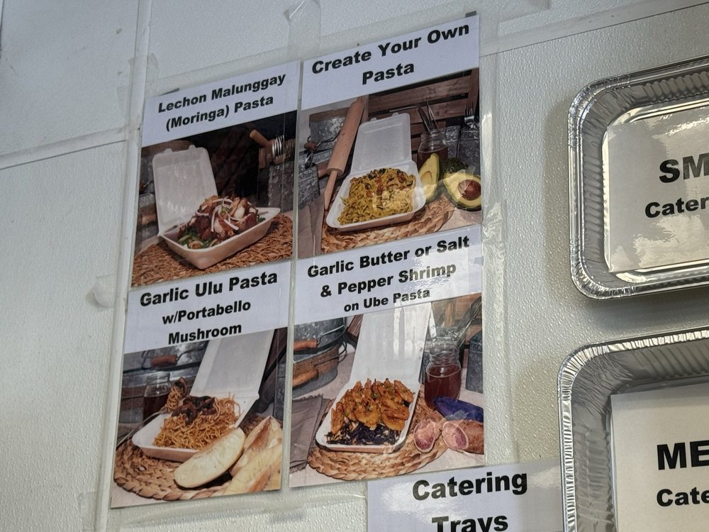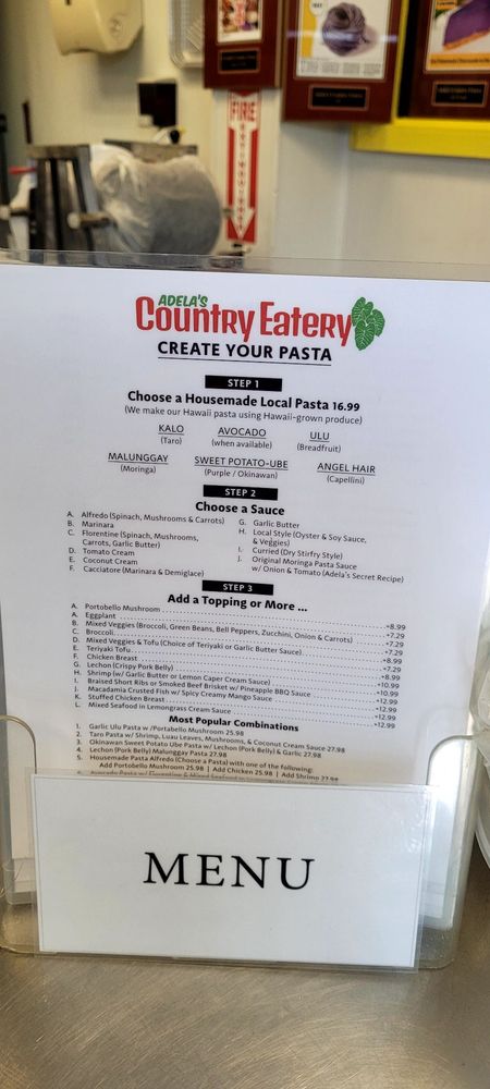 First choose a Local Pasta. Then choose a sauce: . Alfredo . Marinara . Florentine (Spinach, mushrooms, carrots, garlic butter) . Tomato Cream . Coconut Cream . Cacciatore (marinara & demiglace) . Garlic Butter . Local Stir-fried Style . Curried (dry stir-fry style) . Original Moringa Pasta Sauce (Adelas Secret Recipe). Next add a topping: . Portobello Mushroom . Eggplant . Mixed Veggies (broccoli, green beans, beansprouts, bell peppers) . Chicken Breast . Lechon (Crispy Pork Belly) . Shrimp Scampi (w/ Garlic Butter or Lemon Caper Cream Sauce) . Braised Short Ribs or Smoked Beef Brisket w/ Pineapple BBQ Sauce . Macadamia Crusted Fish w/ Spicy Creamy Mango Sauce . Stuffed Chicken Breast